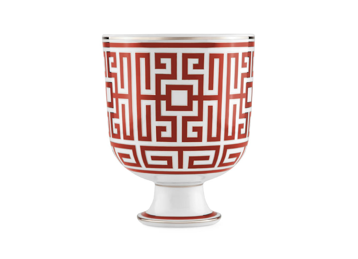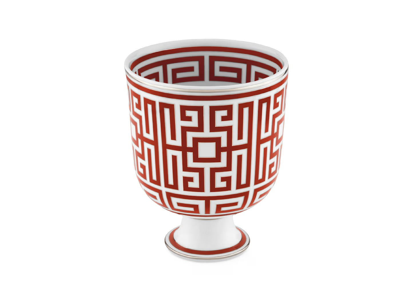 Il decoro geometrico rosso scarlatto risalta e si illumina attraverso la pregiata filettatura in platino che impreziosisce e definisce il design. Disponibile anche in diverse varianti colore il vaso cachepot è pensato per accogliere piante ornamentali, in composizioni personali. Labirinto, disponibile in assortimento completo da tavola, tè e caffè e altri raffinati complementi d’arredo, nasce dal genio creativo di Gio Ponti e rappresenta l’unione tra tradizione e contemporaneità, attraverso le geometrie perfette del decoro e la maestria dell’artigianalità italiana.
