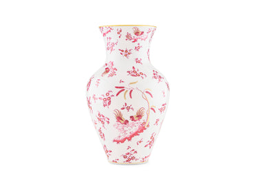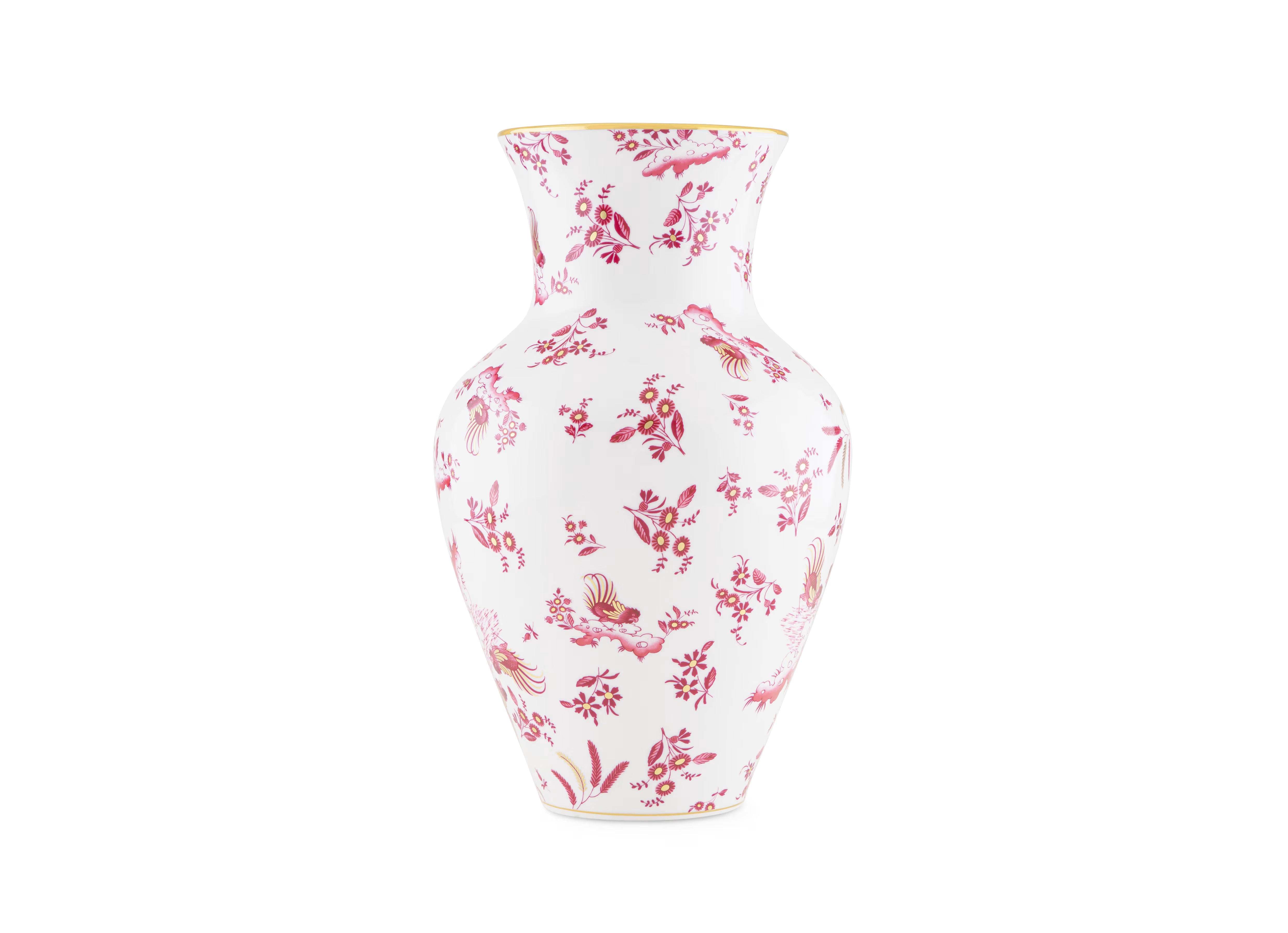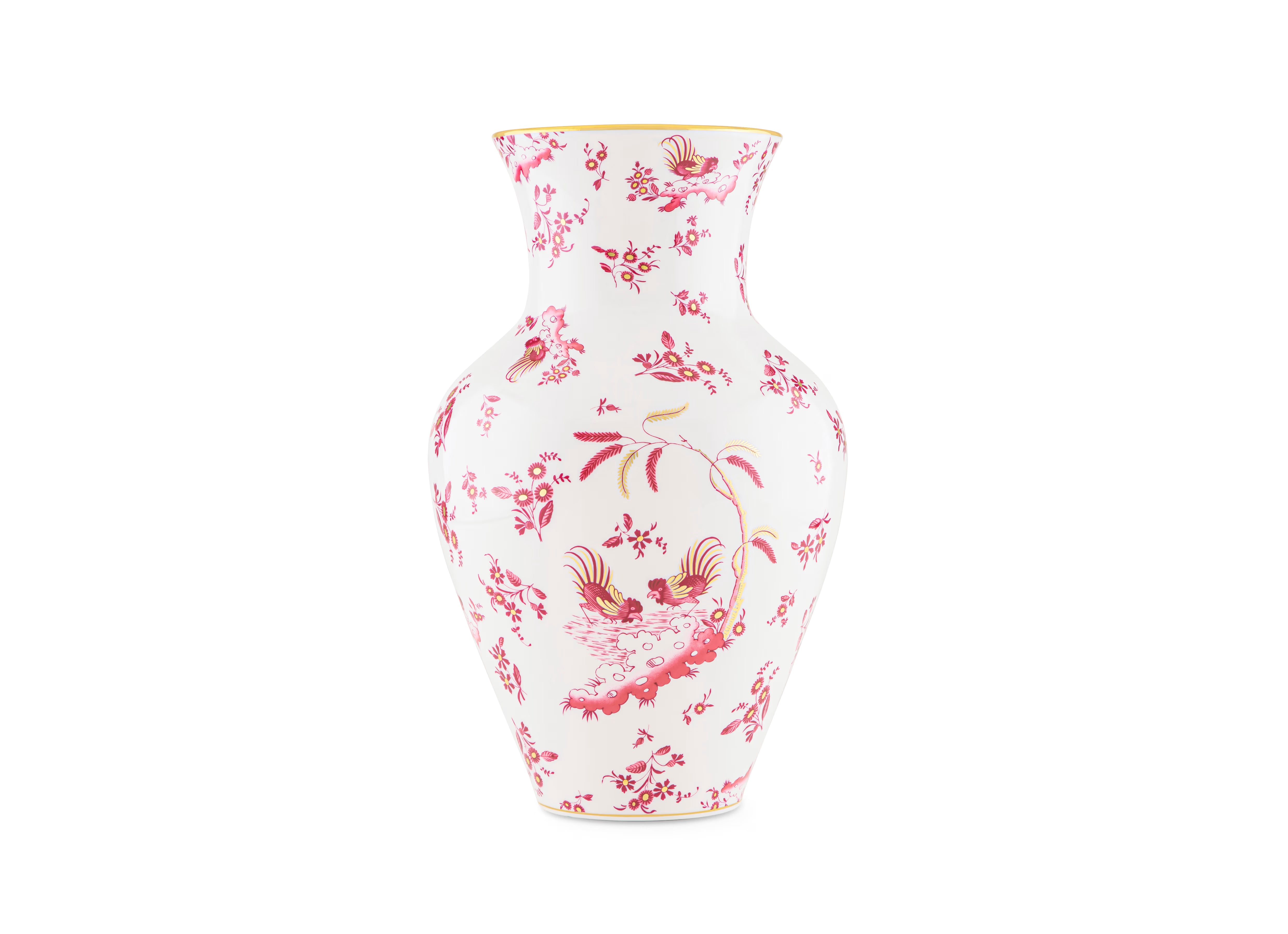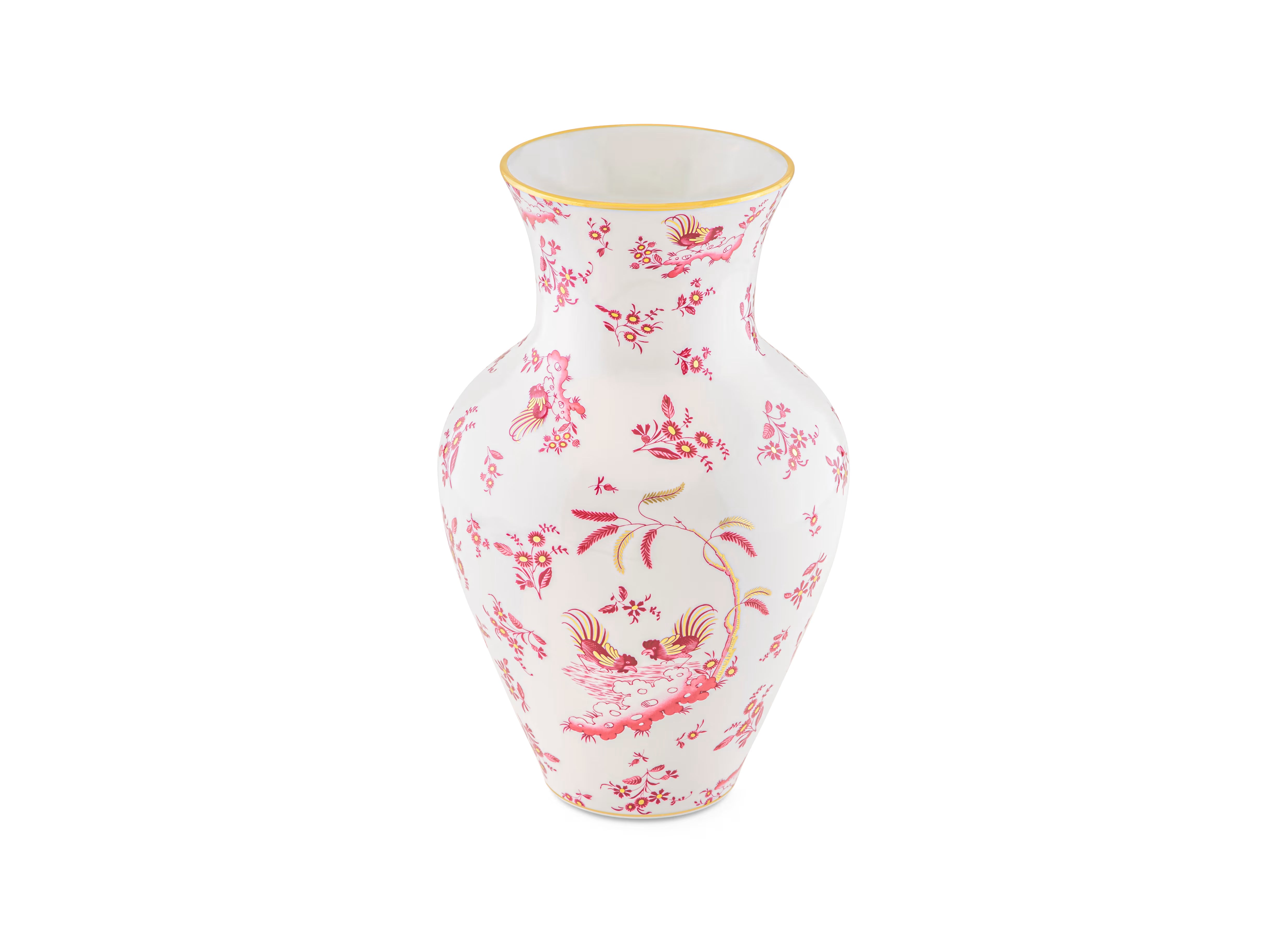 Vaso Ming in porcellana con decoro rosso e oro. Collezione Oro di Doccia. Presenta un decoro rosso magenta raffigurante i galli Ji Ondori, simboli di virtù e buona fortuna, che emergono tra fili d'oro decorati a mano.